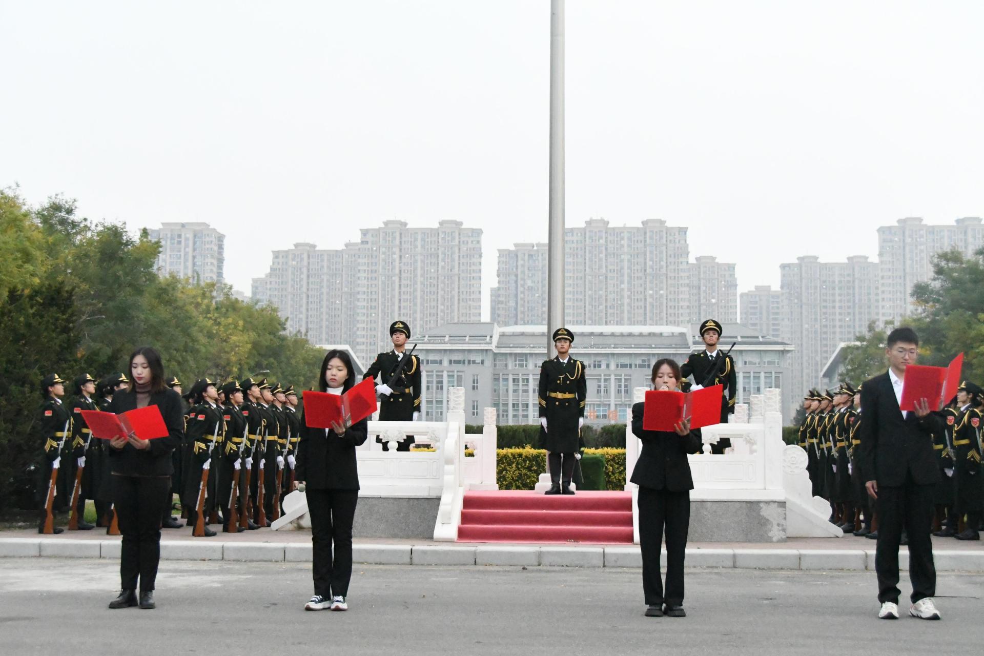 升旗仪式在学校大学生国旗护卫队整齐划一、铿锵有力的步伐中拉开了序幕。国旗下激昂的演讲,更加坚定了同学们勇往直前的信念;庄严宣誓的话语,顿时燃起拼搏之志。