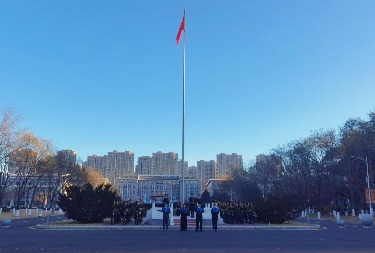 晨光初启,大学生国旗护卫队迈着铿锵有力的步伐,护卫五星红旗庄严入场。在雄壮的国歌声中,鲜艳的五星红旗冉冉升起,全体师生肃立行注目礼,目光中饱含着对祖国的崇高敬意与深沉热爱。